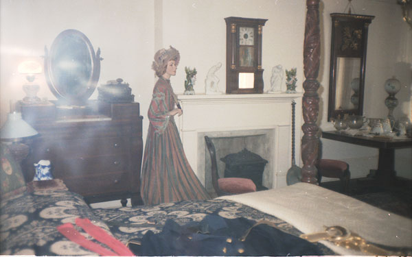 The room the photo was taken in was known as the upstairs sitting room. I was standing inside a booth with plexiglass sides that allowed one to enter the room a couple of feet beyond the doorway to look at the entire room without being able to touch the displays inside. When I took the photo above, my wife was down the hall behind me at the other end of the floor and our friend was downstairs. There was no one else on the second floor, no one nearby.